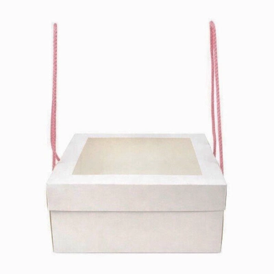 Белая коробка для десертов с прозрачным окном и ручками-шнурками. Размер 248×248×110 мм. 1шт