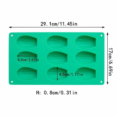 Силиконовая форма для выпечки «Мадлен» предназначена для приготовления изысканных французских пирожных с хрустящей корочкой и нежной сердцевиной. В форме 9 ячеек, каждая длиной 6,8 см, шириной 4,5 см и глубиной 0,8 см.