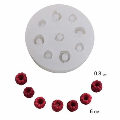 Силиконовая форма «Малина» предназначена для изготовления реалистичных ягод из мастики, шоколада, изомальта или айсинга. Размер молда — диаметр 6 см, высота 1,8 см. Размер одной ягоды — около 0,8 см.