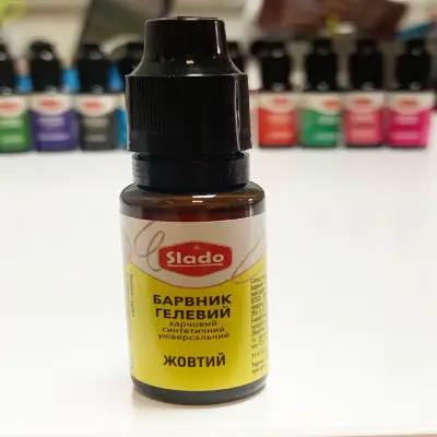 Гелевый пищевой краситель Slado Желтый — универсальный синтетический краситель для кремов, мастики, айсинга, теста и других десертов. Обеспечивает желтый оттенок и равномерное окрашивание.