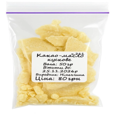 Какао-масло кусковое, вес 50 грамм. Натуральный продукт, используется для приготовления шоколада, десертов и косметических средств.