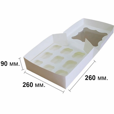 Белая коробка на 9 капкейков с прозрачным окошком — практичное и стильное решение для упаковки ваших десертов. Изготовлена из прочного картона, который обеспечивает надежную защиту при транспортировке. Вставка с девятью ячейками предотвращает смещение капкейков, сохраняя их форму и внешний вид. Прозрачное окошко позволяет эффектно продемонстрировать изделия. Размер коробки — 26 × 26 × 9 см.