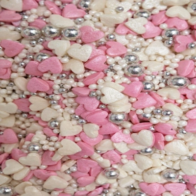 Кондитерская посыпка «Прикосновение любви» — нежный микс розовых и кремовых сердечек, мелких жемчужных бусин и серебряных драже. Идеально подходит для украшения тортов, капкейков, бенто-тортов, кейк-попсов, пряников и других десертов. Посыпка создаёт романтичное и праздничное настроение, красиво смотрится на креме, глазури и мастике. Отличный выбор для Дня святого Валентина, свадеб, детских праздников и подарочных десертов.