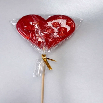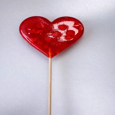 Леденец выполнен из прозрачного сахара с декоративной посыпкой в виде сердечек, что придаёт ему яркий и праздничный вид.