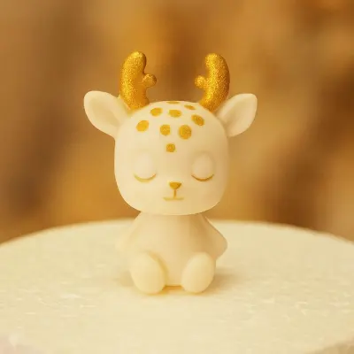 ✨ Шоколадная фигурка «Олененок с золотыми рожками» – изысканный и нежный декор для торта или праздничного стола. Маленький олененок с закрытыми глазами выглядит спокойным и сказочным, словно погруженный в сладкие сны. Золотые рожки и пятнышки на головке придают фигурке праздничности и изящному блеску.