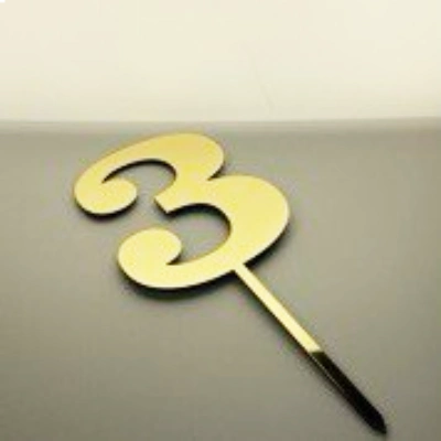 Золотой топпер в форме цифры 3 — стильное украшение для любого праздничного торта. Выполнен из качественного полистирола с зеркальным золотым покрытием, устойчив к влаге и сохраняет блеск даже после использования. Идеально подходит для оформления тортов на день рождения или юбилей. Высота самой цифры — 7 см.