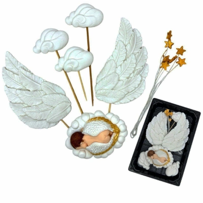 Кондитерское украшение «Крылатые сны 2D» — изящный набор для оформления тортов и десертов. В комплект входит 13 декоративных элементов: фигурка младенца с крыльями, облака на шпажках, золотые звёздочки и дополнительные детали для создания нежной композиции. Идеально подходит для тортов на крестины, выписку из роддома или детские праздники.