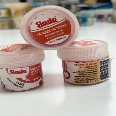 Сухой жирорастворимый пищевой краситель Slado в оттенке рубин придаёт изделиям насыщенный, глубокий красно-бордовый цвет. Идеален для окрашивания шоколада, масляных кремов, мастики, ганаша и других жировых смесей. Краситель обеспечивает равномерное распределение цвета, устойчив к нагреву и свету. Вес 2 гр. Производитель — Украина.